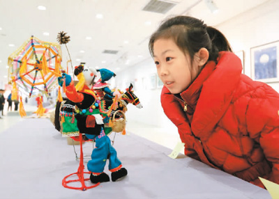 12月10日,第二届全国大学生“纺织类非物质文化遗产”创意创新作品大赛在云博·体育举行。大赛参赛作品分为收集类、制作类和设计类三个类别,通过对“非遗+新时尚”这一主题的探索与诠释,展现出纺织类非物质文化遗产特色与时尚流行元素的融合。图为一名小朋友在参观西安工程大学的参赛作品《关中犟驴》。