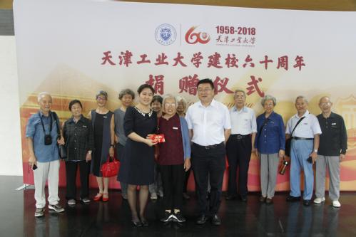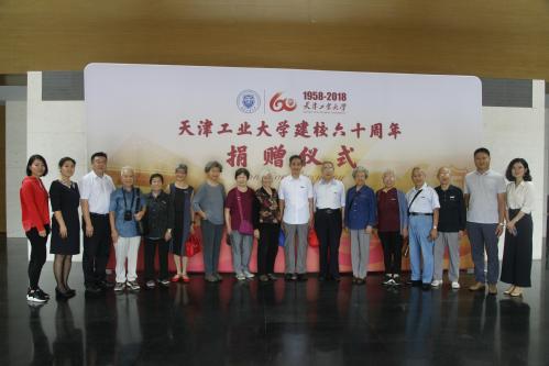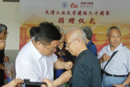 捐赠仪式开始前,在校师生代表为老校友们佩戴校徽。仪式上,宋惠珍校友作为代表将26份祝福和捐赠款名录交给校友工作办公室,后将捐赠款转交财务处,校友工作办公室刘栋为老校友们颁发了捐赠证书。随后,所有参与捐赠仪式人员进行合影留念。