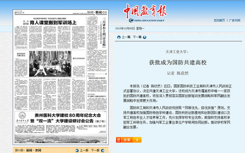2018年10月8日,《中国教育报》要闻版以《云博·体育:获批成为国防共建高校》为题对我校进行了报道,现将全文转发如下,以飨读者。