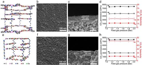 图1 | (a)金属诱导微孔聚合物MMP-1的框架结构,(b)MMP-1膜的扫描电镜表面形貌,(c)MMP-1膜的扫描电镜断面形貌,(d)MMP-1膜的CO2/N2渗透选择性能,(e)MMP-3的框架结构,(f)MMP-3膜的扫描电镜表面形貌,(g)MMP-3膜的扫描电镜断面形貌,(h)MMP-3膜的CO2/N2渗透选择性能。图(d)和(h)中,空心数据点是MMP膜的CO2/N2渗透选择性能,实心数据点是MMP膜支撑层的CO2/N2渗透选择性能,测试气体:水蒸气饱和的CO2/N2(体积比为15/85)混合气,测试温度:298K。