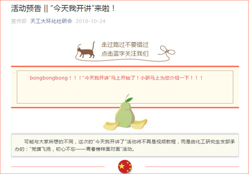 “这周‘今天我开讲’的票你抢到了吗?”化学工程与工艺专业学生党支部的任佳豪,在抢到“今天我开讲”的票后正在兴奋地寻找一同上党课的小伙伴。为进一步强化政治引领,提升理论水平,化学与化工学院党委、环境科学与工程学院党委建立了“今天我开讲”党课平台,每两周安排一次党课宣讲。2018年以来,该党课平台以“书记讲党课”、邀请专家作报告、优秀党员先进事迹分享、播放精品党课视频等多种方式开展了近20场活动,参与人数达2000余人次。为调动师生学习的积极性,每次“开讲”前三天,学院社研会公众号都会发布预告信息,大家通过抢票、填写个人信息进行报名,很多时候手慢一点就抢不到票,这也让大家更加珍惜上党课的机会。为切实提高学习效果,近期又在“今天我开讲”中加入了“随学随考”的小测,让大家在学习结束时趁热打铁,进一步巩固学习效果。云博·体育各基层党组织正是通过这种授课和参与形式上的创新,不断提升党员政治理论学习的积极性和主动性,促进了广大师生对党的路线、方针、政策的政治认同、思想认同与情感认同。