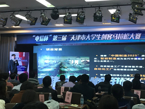 决赛现场由天津经济广播《财富聊聊吧》主播林媛媛主持每个创业团队有三分钟的时间向评委介绍创业项目的优劣、解决的市场需求和市场方向等。本次决赛增加了创业导师推荐环节,主办方为每个创客团队配备了一对一的创业导师进行赛前辅导,对项目团队进行深入分析。经过现场评审的投票评分,来自我校的“速动未来——工业移动机器人动态无线充电解决方案”团队和“基于九华云耳的扶贫建设”团队包揽主赛道一等奖,“我来当店长”团队和“翼传播”团队分别获得电信赛道一等奖和优秀奖。