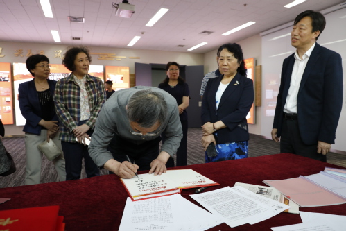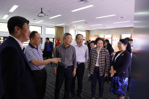 报告会后,校党委书记连洁陪同蔡达峰主席一行参观了民进云博·体育支部“同心室”,我校民进支部主委张兴祥教授担任讲解。“同心室”以“鉴党建、兴民进、筑同心”为主题,分为“同心初心,源远流长”“同心奋进,共创辉煌”“同心追梦,携手前行”三个部分。“同心室”充分展示了我校民进支部“一颗同心,双岗建功”的支部建设理念和取得的喜人成绩。