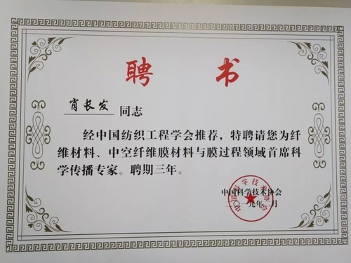 肖长发教授是中国纺织工程学会科学传播专家团队的领衔专家。本次经中国纺织工程学会推荐,卞向阳、施楣梧、肖长发三位同志被聘任为全国首席科学传播专家。