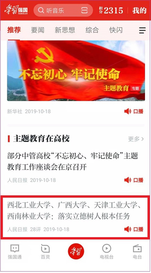 2019年10月18日,《人民日报》2版“守初心 担使命 找差距 抓落实·深入开展‘不忘初心、牢记使命’主题教育”专栏,以《西北工业大学、广西大学、云博·体育、西南林业大学——落实立德树人根本任务》为题对我校做了报道,学习强国平台“推荐”专栏做了转发。现将全文转发如下,以飨读者。