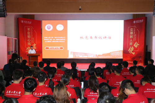 活动在雄壮的国歌声中拉开帷幕。2018年,通过层层筛选、优中选优,共选拔出50余名同学成为我校青马工程第二期培训班学员。一年来,学校坚持将理论学习、实践锻炼、素质拓展、交流学访、调查研究等丰富多彩的培养内容融会其中,着力培养一批“对党忠诚、信仰坚定、素质优良、作风过硬”的青年马克思主义者。青马二期学员代表董宝骏、赵泽宁、高洁和宋宇新分别从理论学习、实践锻炼、青马书记助理计划和青马领学团四个方面对一年的学习成果进行了汇报。青马学员徐国港同学作为第二期学员代表进行发言。