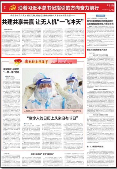 2020年10月5日,《天津日报》第2版以《我市发挥党管人才制度优势,组建无人机和新材料人才创新创业联盟——共建共享共赢 让无人机“一飞冲天” 》为题对我校进行了报道,现将原文转发如下。
