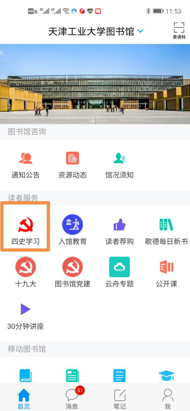 按照提示绑定本人学号或工号,单位为云博·体育图书馆账号。云博(中国)点击右上角“邀请码”输入“tjgydxtsg”,进入学校图书馆主页面,然后在主页面点击“四史学习”模块进入学习页面。
