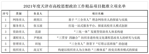 天津市高校思想政治工作精品项目培育建设工作是加强我市高校思想政治工作的重要载体。我校党委高度重视思想政治工作精品项目的立项、中期管理及结项工作,为立项项目提供重要保障。下一步,学校将严格按照《市委教育工委市教委关于开展天津市高校思想政治工作精品项目培育建设的通知》要求,聚焦学校思想政治工作重点,加强协同联动,做好项目培育工作,不断提升思想政治工作水平,全面落实立德树人根本任务。(审稿:党委宣传部 谢光勇 编辑:党委宣传部 刘旭虹)