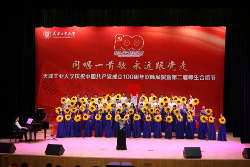 本次歌咏展演特邀了作曲家、音乐教育家、天津音乐学院原音教系主任胡建华教授,天津歌舞剧院原副院长、男高音歌唱家张广庆老师,享受国务院政府津贴、天津歌舞剧院著名女高音歌唱家李青老师,天津歌舞剧院男高音歌唱家、天津市教委学校艺术教育总监刘恩秋老师,中国教育学会原音乐教育分会副秘书长、天津市教委学校艺术教育总监李同全老师等嘉宾担任评委。比赛在雄壮的《没有共产党就没有新中国》《团结就是力量》和优美的《唱支山歌给党听》歌声中拉开帷幕。由各基层党委、党总支、直属党支部师生代表组成的20支队伍接续上场,艺缘合唱团的学生带来了特别的助演节目《美丽的草原我的家》《在灿烂阳光下》。