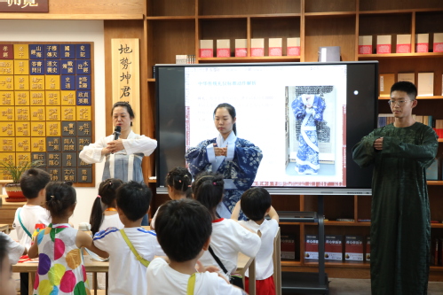 开馆仪式结束,数字国学馆面向到场师生开展了实践体验课,由国学时代教育培训部总监吴涛带领大家走进数字国学馆,从馆内布局到数字资源,从经史子集到诸子百家,向大家介绍了数字国学馆有“知识存储”的特性,又能弘扬传统文化;国学时代市场运营部高级讲师、高级传统文化讲师张萌为大家带来主题为“衣冠上国 礼仪之邦”汉服文化体验课,张萌先生身着汉服,带领大家了解汉服,学习汉服文化,在场师生站姿端正、拱手作揖,学习华夏礼仪。置身于此,聆听经典,师生们深深感受到传统文化根植于心的重要性。老师们纷纷表示打开了育人新思路,要借助数字国学馆,依托丰厚的教育资源,使中华优秀传统文化落地生根。