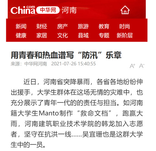 谈及自己第一时间加入防洪救灾工作,吴宜珊说:“作为志愿者参与家乡救灾是我义不容辞的责任。一方有难,八方支援,自己只是尽了微薄之力。在志愿服务工作中,我感受到了浓浓的‘亲情’和温暖,我要向所有参与到救援行动中的人致敬,河南加油,河南必胜。”