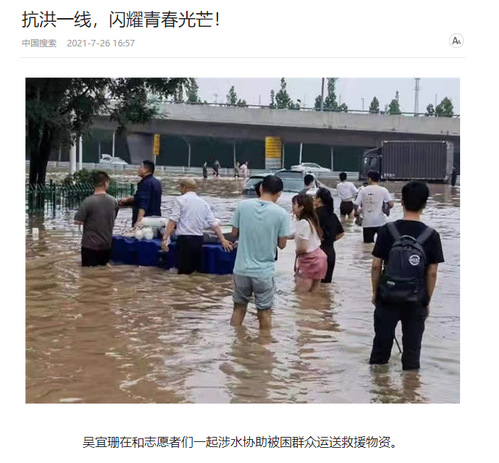 “人民至上、生命至上”。720日,河南省郑州遭遇极端强降雨,致使市区严重内涝,交通中断。我校数学科学学院数学1902班吴宜珊同学当时正在管城回族区参加学习培训。面对暴雨来袭和城区大面积的停水停电,她深知自己是一名共产党员,要迎难而上,学史力行,因此毫不犹豫地加入到了防汛救灾志愿者行列,用实际行动诠释出共产党员的责任与使命。