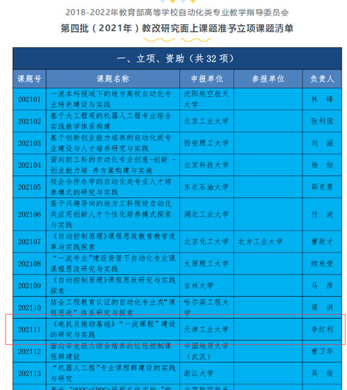 2021811日,第四批(2021年)全国自动化专业教育教学改革研究课题立项名单公布,控制科学与工程学院教师李红利申报的课题“《电机及拖动基础》‘一流课程’建设的研究与实践”获批立项资助。此次课题全国共批准立项63项,其中资助32项,天津市获批资助立项2项,我校1项。