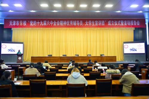 天津市委教育工委专职副书记孙志良在讲话中指出,成立天津市学校“党的十九届六中全会精神优秀辅导员、大学生宣讲团”就是为进一步发挥广大优秀辅导员、优秀学生的榜样引领作用,帮助全市学生深刻领会《中共中央关于党的百年奋斗重大成就和历史经验的决议》精神实质,准确把握《决议》核心要义,深入了解百年来党领导人民创造的伟大成就,深刻理解党百年奋斗的历史意义,努力成长为担当民族复兴大任的时代新人。他强调,要胸怀“两个大局”、心系“国之大者”,增强学习宣传贯彻全会精神的政治自觉、思想自觉和行动自觉;要领会精神实质、把握核心要义,确保学习宣传全会精神准确到位;要精心组织安排、营造浓厚氛围,推动全会精神在天津市学校深入人心、落地见效。他勉励宣讲团师生要在当好全会精神的“学习者”“宣传者”的同时,更要当好“践行者”,把全会精神转化为守初心、担使命的脚下力量,把学习成果转化为爱党爱国爱社会主义的热情,转化为推动天津高质量发展、全面建设社会主义现代化大都市的实在业绩,以优异成绩迎接党的二十大胜利召开。