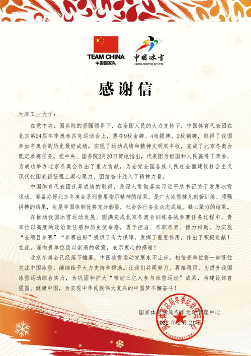 日前,我校收到了国家体育总局冬季运动管理中心发来的感谢信,信中对我校在2022年北京冬奥会期间提供的帮助和支持表示肯定并致以诚挚的谢意。
