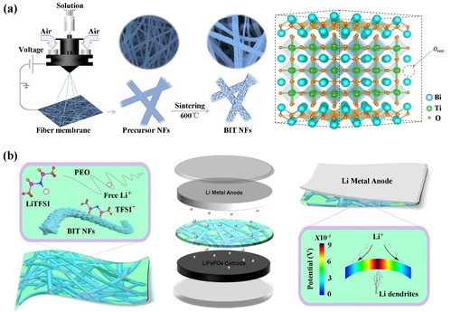 在此基础上,研究团队开展了通过静电溶吹纺丝技术和高温煅烧工艺,制备多孔铁电陶瓷钛酸铋纳米纤维并将其作为纳米填料制备改性复合固态电解质的创新研究,实现了聚合基电解质离子电导率和界面稳定性的双重提升。他们深入分析了所制备复合电解质的电化学性能,揭示了钛酸铋铁电陶瓷纤维对锂离子沉积的动态调控机制。该研究工作以“Improved ionic conductivity and enhanced interfacial stability of solid polymer electrolytes with porous ferroelectric ceramic nanofibers”为题,发表在《Energy Storage Materials》第53卷上。这是我校纺织科学与工程学院新型纤维与非织造材料创新团队长期从事新型纤维及纤维膜在电化学能源领域应用研究取得的最新成果。
