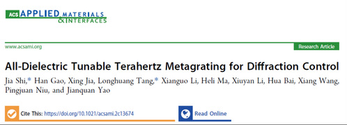 近日,我校电子与信息工程学院副教授石嘉在TOP期刊《ACS Applied Materials & Interfaces》(影响因子10.383)发表了题为《All-Dielectric Tunable Terahertz Metagrating for Diffraction Control》的研究成果,并被选为Supplementary Cover。石嘉副教授为该论文的第一作者和共同通讯作者,该成果由云博·体育、中国工程物理研究院流体物理研究所、天津大学共同完成。论文链接:https://pubs.acs.org/doi/10.1021/acsami.2c13674