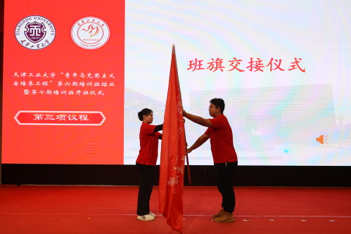 第七期学员代表王嘉成从第六期学员代表孙越手中接过“青马工程”培训班班旗,标志着“青马工程”第七期培训班正式启动。戚茸妍同学代表第七期培训班学员作了发言。同学们用诗朗诵《砥砺奋进新征程 建功立业新时代》表达了青马学员的爱党之情、强国之志。