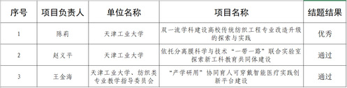 近日,教育部公布了第二批全国新工科研究与实践项目结题验收结果,我校三个项目均验收通过,其中陈莉教授负责的“双一流学科建设高校传统纺织工程专业改造升级的探索与实践”项目成为天津市属高校中唯一验收结果为优秀的项目,我校也是市属高校中唯一在第一批和第二批新工科项目中均获批“优秀”结题的学校。