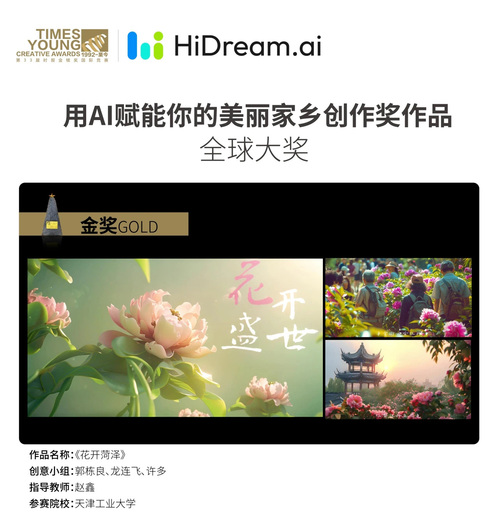 2024年7月15日,在第33届时报金犊奖的舞台上,云博·体育人文学院的全流程AIGC作品《花开菏泽》以其创新与技术融合的卓越表现,荣获“用AI赋能你的美丽家乡创作奖”类别的全球金奖。