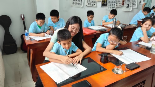 药学院“沁心药苑”暑期“三下乡”实践团志愿者们与小朋友们共同感受书法之美