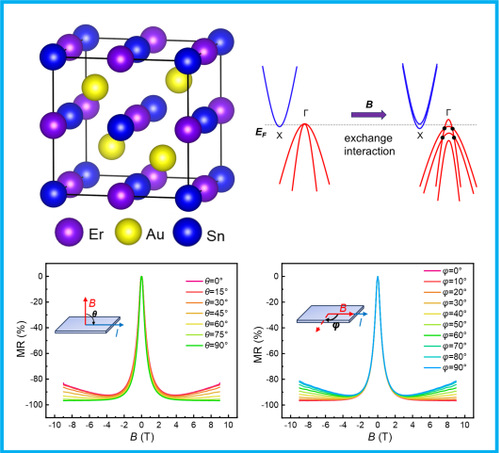针对这一难题,研究团队利用half-Heusler合金特殊的能带结构以及强交换场效应,提出磁场协同调控材料磁结构-能带结构的策略,设计并制备出高质量反铁磁half-Heusler合金ErAuSn单晶样品,通过磁场诱导合金发生反铁磁性到铁磁性的转变,导致电子能带结构发生剧烈变化,进而引起该合金从窄带隙半导体相到Weyl半金属相的转变,在磁输运上表现出了任意磁场方向高达~97%大磁阻效应,这为如何设计开发具有大磁阻材料提供了理论和实验指导。
